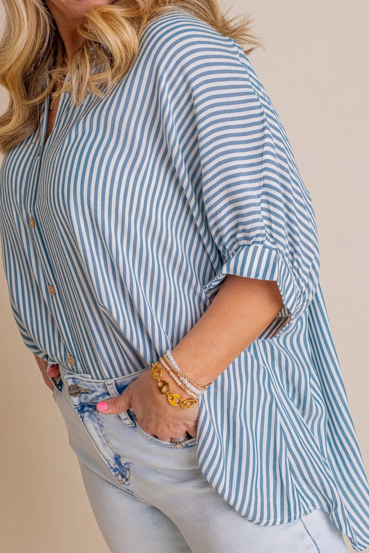 With lightweight fabric and a flowy oversized fit, this top will keep you feeling comfortable and carefree. The striped design, collared neckline, dolman sleeves, and high low hem add a touch of whimsy to your wardrobe.